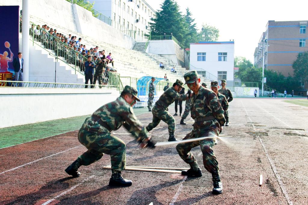盛大而精彩的分列式表演随着一阵嘹亮的杀敌声开始,女生匕首操方阵和男生军体拳方阵冲进了表演场地。他们动作刚劲有力,整齐划一,在教官的指挥下,一丝不苟的完成了所有的指定动作。