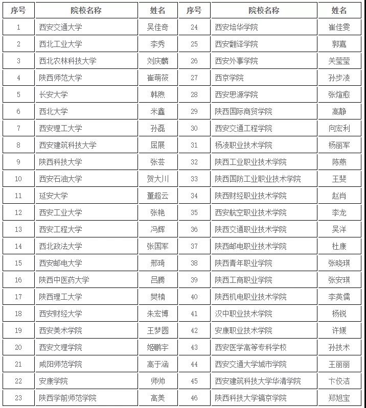 根据《关于开展全省高校毕业生就业系统评优表彰活动的通知》,经高校申报,专家评审,省高等学校毕业生就业服务中心拟对2021年陕西高校19个就业工作先进集体,44个就业工作先进个人,60个就业工作优秀工作者,46个就业工作优秀信息员,15个最佳招聘单位和11个就业工作奉献奖获得者进行表彰(名单见附件),现予以公示。 公示期间如对公示对象有异议,可通过电子邮件形式向陕西省高等学校毕业生就业服务中心实名反映。单位反映情况的,请出具正式函件PDF版并加盖公章;个人提出异议的,须署真实姓名、身份证号,并提供有效联系方式。 公示时间:2022年1月16日—21日 联系人:陈靖 电 话:029—88668820 邮 箱:410359160@qq.com 地 址:西安市长安南路563号陕西省教育厅北楼 邮 编:710061 陕西省高等学校毕业生就业服务中心 2022年1月16日 2021年陕西高校就业工作先进集体拟表彰名单 1. 西北农林科技大学 2. 西安电子科技大学 3. 陕西师范大学 4. 西北大学 5. 西安理工大学 6. 西安建筑科技大学 7. 陕西科技大学 8. 西安石油大学 9. 西安外国语大学 10. 西安邮电大学 11. 西安培华学院 12. 西安外事学院 13. 西京学院 14. 杨凌职业技术学院 15. 陕西国防工业职业技术学院 16. 陕西交通职业技术学院 17. 陕西铁路工程职业技术学院 18. 西安铁路职业技术学院 19. 咸阳职业技术学院 2021年陕西高校就业工作先进个人拟表彰名单